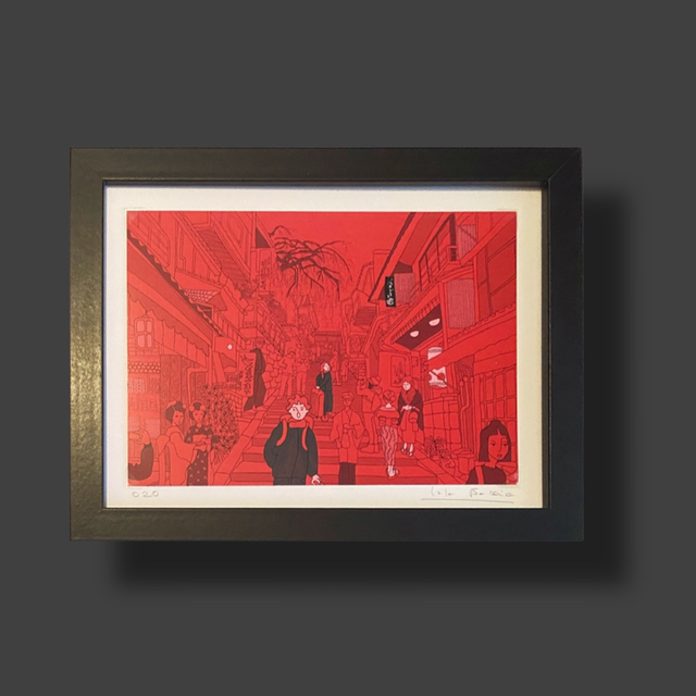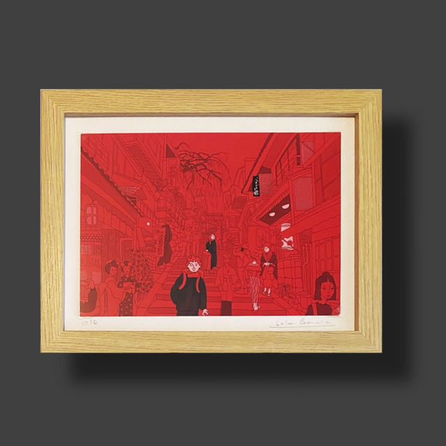 Ilustración digital original por Lola Barcia Albacar. De la serie “Japón enlatado” su tamaño es de 20x14cm, enmarcada con esquineras sobre pass-par-tout, ejemplares numerados y firmados por la autora . El marco es de madera y su medida total es de 26,50x 20,5cm .