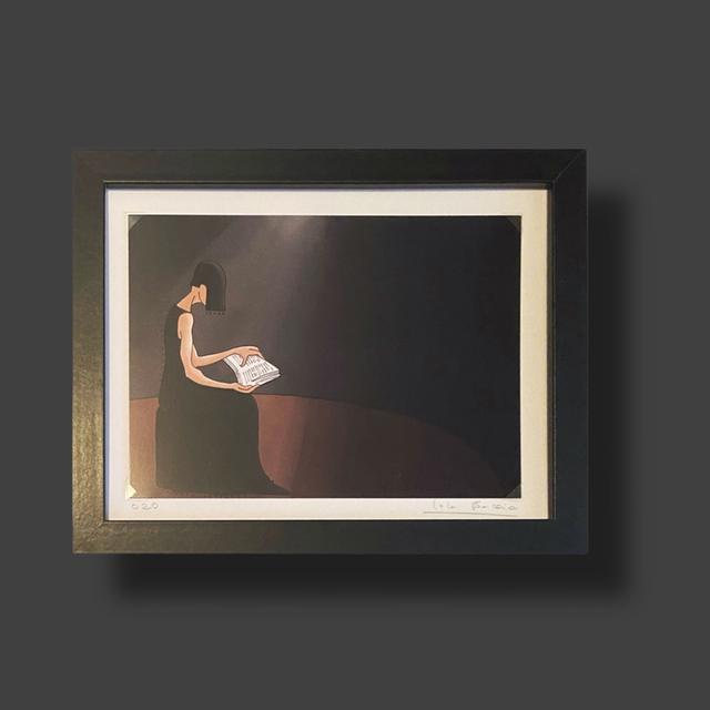 Ilustración digital original por Lola Barcia Albacar. De la serie “Mujeres leyendo” su tamaño es de 20x14cm, enmarcada con esquineras sobre pass-par-tout, ejemplares numerados y firmados por la autora . El marco es de madera y su medida total es de 26,50x 20,5cm .